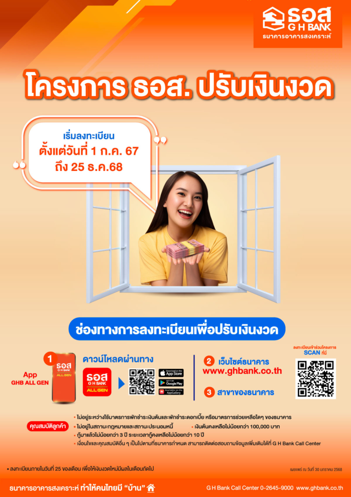 สอบถามข้อมูลเพิ่มเติม ได้ที่ G H Bank Call Center โทร.0-2645-9000 กด 5 หรือ Facebook Fanpage ธนาคารอาคารสงเคราะห์ หรือดูข้อมูล บ้านมือสอง ธอส. ได้ที่ www.ghbhomecenter.com, Mobile Application : GHB ALL HOME และ Line Official Account : @GHBALLHOME
