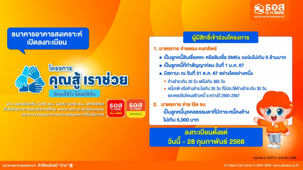 ธนาคารอาคารสงเคราะห์ (ธอส.) ในฐานะสถาบันการเงินของรัฐ สังกัดกระทรวงการคลัง ที่มีพันธกิจ “ทำให้คนไทยมีบ้าน” พร้อมให้ความช่วยเหลือและแบ่งเบาภาระลูกค้าในการชำระเงินงวด เพื่อให้สามารถรักษาบ้านของตนเองไว้ได้ต่อไป โดยเปิดให้ลูกค้าของธนาคารลงทะเบียนเข้าร่วม “โครงการคุณสู้ เราช่วย”ผ่านช่องทางต่างๆ ประกอบด้วย เว็บไซต์ของธนาคารแห่งประเทศไทย www.bot.or.th/Khunsoo หรือ Application : GHB ALL GEN และ Application :GHB ALL BFRIEND ตั้งแต่วันนี้ ถึงวันที่ 28 กุมภาพันธ์ 2568 โดยลูกค้าที่สามารถเข้าร่วมโครงการจะต้องเป็นผู้ที่มีวงเงินสินเชื่อไม่เกิน 5 ล้านบาท ที่ทำสัญญาก่อนวันที่ 1 มกราคม 2567 และมีสถานะค้างชำระเกิน 30 วัน แต่ไม่เกิน 365 วัน หรือมีสถานะค้างชำระไม่เกิน 30 วัน ที่เคยปรับโครงสร้างหนี้และเคยค้างชำระมากกว่า 30 วัน ระหว่างปี 2565 – 2567 (สถานะดังกล่าวนับ ณ วันที่ 31 ตุลาคม 2567) สำหรับโครงการคุณสู้ เราช่วย เป็นโครงการที่ธนาคารแห่งประเทศไทย จัดทำขึ้นเพื่อช่วยบรรเทาภาระหนี้สินของประชาชนและภาคธุรกิจที่ได้รับผลกระทบจากสถานการณ์เศรษฐกิจ พร้อมทั้งส่งเสริมให้ประชาชนและผู้ประกอบการสามารถฟื้นฟูและกลับมายืนหยัดได้ในระยะยาว โดยแบ่งความช่วยเหลือออกเป็น 2 มาตรการ ประกอบด้วย “มาตรการจ่ายตรง คงทรัพย์” และ “มาตรการจ่าย ปิด จบ” โดยผู้ที่สนใจเข้าร่วมโครงการสามารถสอบถามรายละเอียดเพิ่มเติมได้ที่ ธอส.ทุกสาขา ทั่วประเทศ หรือ G H Bank Call Center โทร.0-2645-9000 หรือ Facebook Fanpage ธนาคารอาคารสงเคราะห์ และติดตามข่าวสารของธนาคารได้ที่ Application :GHB ALL GEN และ www.ghbank.co.th ฝ่ายสื่อสารองค์กร