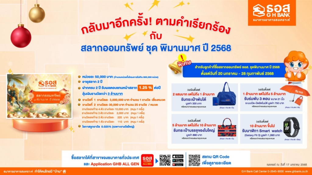 ธนาคารอาคารสงเคราะห์ (ธอส.) เปิดจำหน่าย “สลากออมทรัพย์ ธอส. ชุดพิมานมาศ ปี 2568” อายุสลาก 2 ปี ให้ผลตอบแทนหน้าสลากสูงถึง 1.25% ต่อปี พร้อมลุ้นรับเงินรางวัลใหญ่ ตลอด 24 งวด ผู้ที่สนใจสามารถซื้อสลากผ่าน Application : GHB ALL GEN และ ธอส. ทุกสาขาทั่วประเทศ ตั้งแต่วันที่ 20 มกราคม 2568 และออกรางวัลครั้งแรกวันอาทิตย์ที่ 16 กุมภาพันธ์ 2568