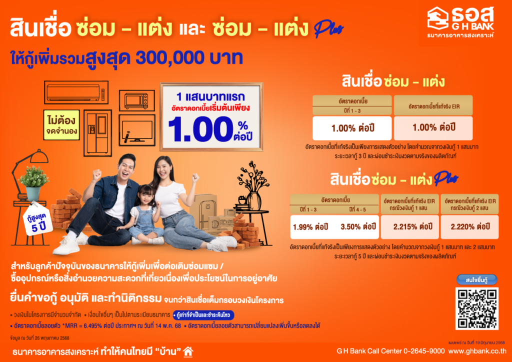 หรือที่ ธอส. ทุกสาขาทั่วประเทศ สอบถามข้อมูลเพิ่มเติมได้ที่ G H Bank Call Center : 0-2645-9000